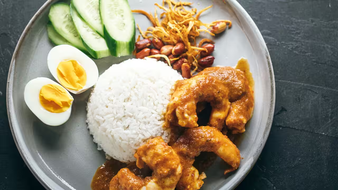 Fragrant coconut rice served with fried egg, chilli sambal, peanuts, anchovies, a few slices of cucumber and accompanied by spicy sambal-coated prawns.